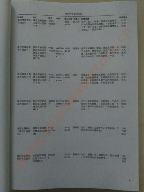 | 惠州港澳臺(tái)投資企業(yè)黃頁(yè) | 包含香港、澳門(mén)、臺(tái)灣地區(qū)在惠州投資企業(yè) | 80% | RMB:500元 |