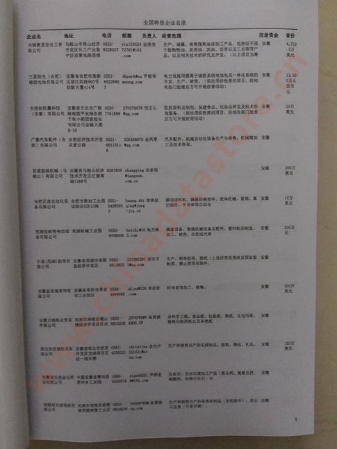 最新韓國在華企業(yè)黃頁主要收錄了韓國在中國境內(nèi)的獨(dú)資、合資、合作經(jīng)營等類型的企業(yè)通信黃頁,韓國外商投資企業(yè)黃頁內(nèi)容有:企業(yè)名稱、地址、電話、傳真、電子郵箱、經(jīng)營范圍、注冊資金等;韓資企業(yè)黃頁都是一些國際上的知名品牌企業(yè)在大陸地區(qū)設(shè)立的分公司及辦事機(jī)構(gòu),這類企業(yè)經(jīng)濟(jì)實力、技術(shù)實力與品牌效應(yīng)都比較強(qiáng),與這類企業(yè)開展合作業(yè)務(wù)是許多國內(nèi)企業(yè)夢寐以求的事情,因此在華韓資企業(yè)名單是各個國內(nèi)企業(yè)提高銷售業(yè)績必備的參考工具!
