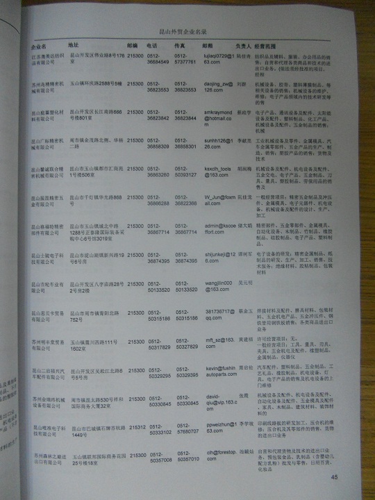 昆山外貿企業(yè)黃頁包括:外貿企業(yè)名稱、地址、電話、傳真、郵箱、經營范圍、注冊資金等信息。