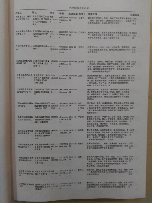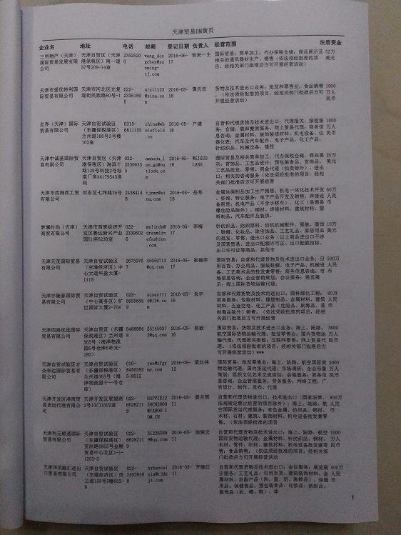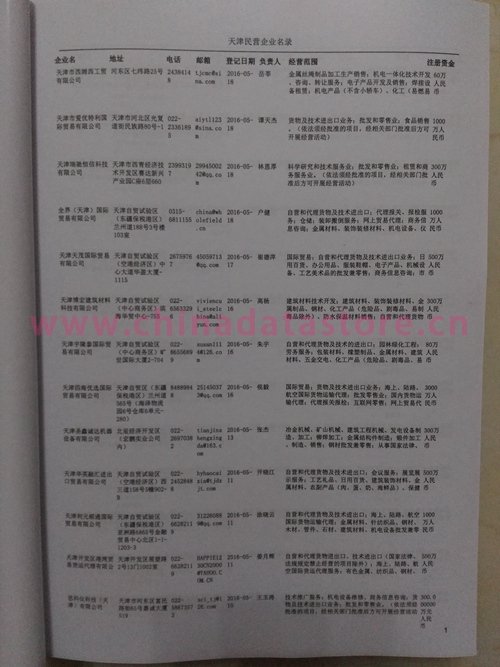 2021版最新天津企業(yè)黃頁包括《天津制造企業(yè)黃頁》、《天津貿(mào)易企業(yè)黃頁》、《天津民營企業(yè)黃頁》、《天津外資企業(yè)黃頁》、《天津外貿(mào)企業(yè)黃頁》共五冊,現(xiàn)優(yōu)惠價(jià):280元/冊。每冊內(nèi)容包括:單位名稱、地址、郵編、電話、傳真、郵箱、經(jīng)營范圍等;天津企業(yè)黃頁涵蓋了近幾年來最新成立的、有一定規(guī)模的企業(yè),具有非常高的營銷價(jià)值。有了這套黃頁開展業(yè)務(wù)也有了針對性,也省去了盲目去尋找客戶名單而浪費(fèi)的時(shí)間了,工作效率也會有很大的提高。歡迎需要天津企業(yè)黃頁的朋友及時(shí)聯(lián)系我們!