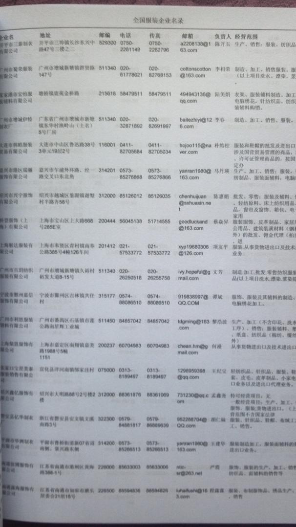 服裝外貿(mào)企業(yè)黃頁包括:外貿(mào)企業(yè)名稱、地址、電話、傳真、郵箱、經(jīng)營范圍、注冊(cè)資金等信息。
