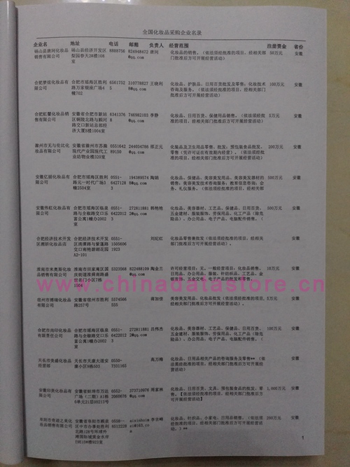 2024年新版中國(guó)化妝品采購(gòu)企業(yè)黃頁(yè),收錄了全國(guó)各地經(jīng)營(yíng)范圍涉及化妝品產(chǎn)品的貿(mào)易企業(yè),這些都是頗具實(shí)力的化妝品產(chǎn)品的中國(guó)采購(gòu)商。黃頁(yè)內(nèi)容包含:企業(yè)名稱、地址、電話、傳真、郵箱、經(jīng)營(yíng)范圍、省份、注冊(cè)資金等信息。該套黃頁(yè)包含一個(gè)黃頁(yè)光碟加一冊(cè)紙質(zhì)書刊,全國(guó)價(jià)格:1500元,省/直轄市價(jià)格:400元,城市價(jià)格:200元,共收錄了全國(guó)各地大概28010(統(tǒng)計(jì)日期:2018.1)家化妝品產(chǎn)品采購(gòu)企業(yè)。黃頁(yè)光碟中是EXCEL格式,信息可任意修改、復(fù)制、打印、導(dǎo)出及導(dǎo)入到傳真、郵件群發(fā)等軟件中,無(wú)任何限制。