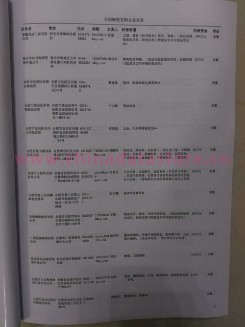 2024年新版中國(guó)陶瓷采購(gòu)企業(yè)黃頁(yè),收錄了全國(guó)各地經(jīng)營(yíng)范圍涉及陶瓷產(chǎn)品的貿(mào)易企業(yè),這些都是頗具實(shí)力的陶瓷產(chǎn)品的中國(guó)采購(gòu)商。黃頁(yè)內(nèi)容包含:企業(yè)名稱、地址、電話、傳真、郵箱、經(jīng)營(yíng)范圍、省份、注冊(cè)資金等信息。該套黃頁(yè)包含一個(gè)黃頁(yè)光碟加一冊(cè)紙質(zhì)書(shū)刊,,全國(guó)價(jià)格:1500元,省/直轄市價(jià)格:400元,城市價(jià)格:200元,共收錄了全國(guó)各地大概10500(統(tǒng)計(jì)日期:2018.1)家陶瓷產(chǎn)品采購(gòu)企業(yè)。黃頁(yè)光碟中是EXCEL格式,信息可任意修改、復(fù)制、打印、導(dǎo)出及導(dǎo)入到傳真、郵件群發(fā)等軟件中,無(wú)任何限制。