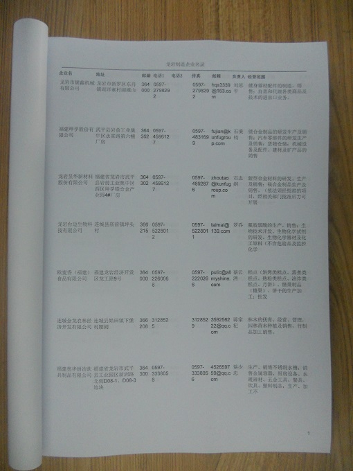 2021版最新龍巖企業(yè)黃頁(yè)包括《龍巖制造企業(yè)黃頁(yè)》、《龍巖民營(yíng)企業(yè)黃頁(yè)》,現(xiàn)優(yōu)惠價(jià):280元/冊(cè)。每?jī)?cè)內(nèi)容包括:?jiǎn)挝幻Q、地址、郵編、電話、傳真、郵箱、經(jīng)營(yíng)范圍等;龍巖企業(yè)黃頁(yè)涵蓋了近幾年來(lái)最新成立的、有一定規(guī)模的企業(yè),具有非常高的營(yíng)銷價(jià)值。有了這套黃頁(yè)開(kāi)展業(yè)務(wù)也有了針對(duì)性,也省去了盲目去尋找客戶名單而浪費(fèi)的時(shí)間了,工作效率也會(huì)有很大的提高。歡迎需要龍巖企業(yè)黃頁(yè)的朋友及時(shí)聯(lián)系我們!