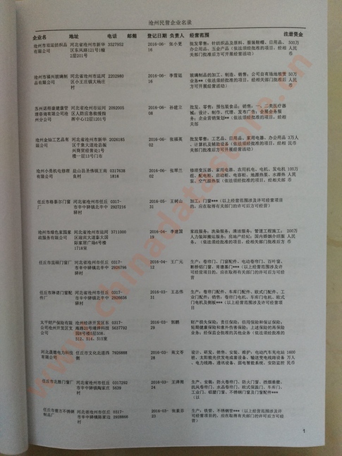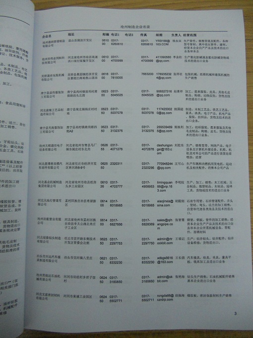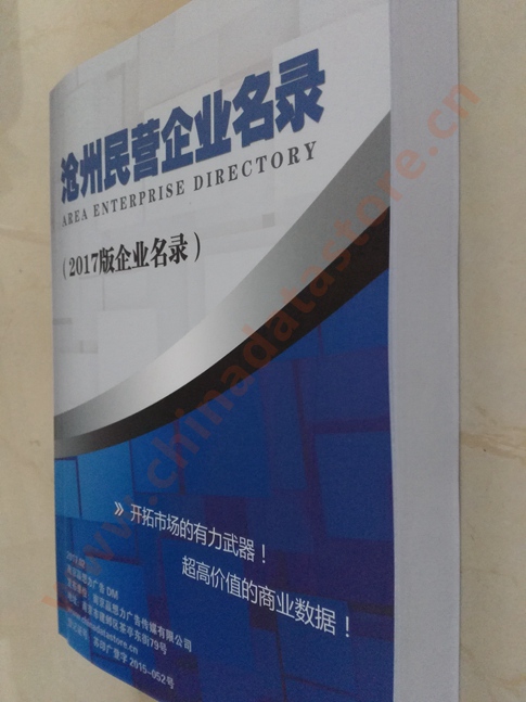 2021版最新滄州企業(yè)黃頁包括《滄州制造企業(yè)黃頁》、《滄州民營企業(yè)黃頁》,現(xiàn)優(yōu)惠價(jià):280元/冊。每冊內(nèi)容包括:單位名稱、地址、郵編、電話、傳真、郵箱、經(jīng)營范圍等;滄州企業(yè)黃頁涵蓋了近幾年來最新成立的、有一定規(guī)模的企業(yè),具有非常高的營銷價(jià)值。有了這套黃頁開展業(yè)務(wù)也有了針對性,也省去了盲目去尋找客戶名單而浪費(fèi)的時(shí)間了,工作效率也會有很大的提高。歡迎需要滄州企業(yè)黃頁的朋友及時(shí)聯(lián)系我們!