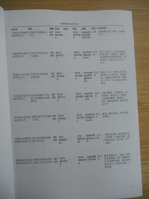2021版最新承德企業(yè)黃頁包括《承德制造企業(yè)黃頁》、《承德民營企業(yè)黃頁》,現(xiàn)優(yōu)惠價(jià):280元/冊(cè)。每冊(cè)內(nèi)容包括:單位名稱、地址、郵編、電話、傳真、郵箱、經(jīng)營范圍等;承德企業(yè)黃頁涵蓋了近幾年來最新成立的、有一定規(guī)模的企業(yè),具有非常高的營銷價(jià)值。有了這套黃頁開展業(yè)務(wù)也有了針對(duì)性,也省去了盲目去尋找客戶名單而浪費(fèi)的時(shí)間了,工作效率也會(huì)有很大的提高。歡迎需要承德企業(yè)黃頁的朋友及時(shí)聯(lián)系我們!
