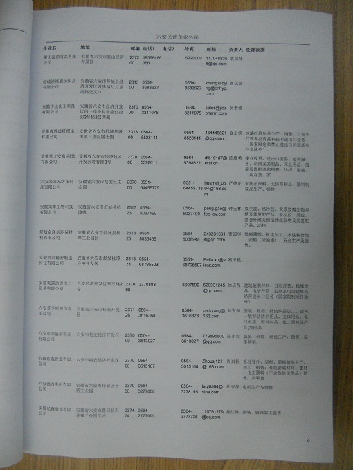2021版最新六安企業(yè)黃頁包括《六安制造企業(yè)黃頁》、《六安民營企業(yè)黃頁》,現(xiàn)優(yōu)惠價(jià):280元/冊。每冊內(nèi)容包括:單位名稱、地址、郵編、電話、傳真、郵箱、經(jīng)營范圍等;六安企業(yè)黃頁涵蓋了近幾年來最新成立的、有一定規(guī)模的企業(yè),具有非常高的營銷價(jià)值。有了這套黃頁開展業(yè)務(wù)也有了針對性,也省去了盲目去尋找客戶名單而浪費(fèi)的時(shí)間了,工作效率也會有很大的提高。歡迎需要六安企業(yè)黃頁的朋友及時(shí)聯(lián)系我們!