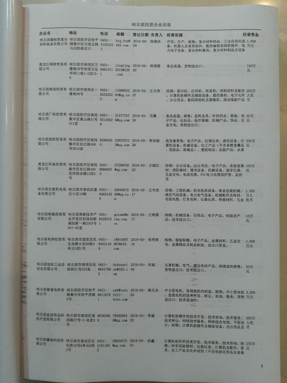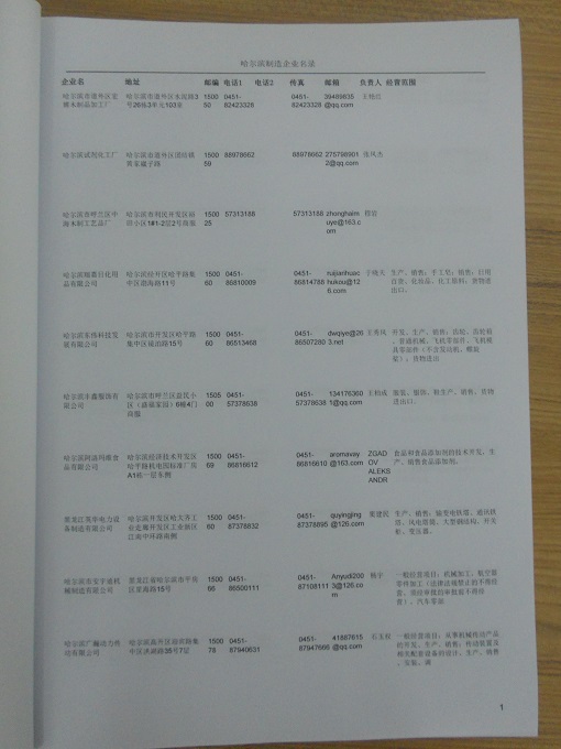 2021版最新哈爾濱企業(yè)黃頁(yè)包括《哈爾濱制造企業(yè)黃頁(yè)》、《哈爾濱民營(yíng)企業(yè)黃頁(yè)》,現(xiàn)優(yōu)惠價(jià):280元/冊(cè)。每?jī)?cè)內(nèi)容包括:?jiǎn)挝幻Q、地址、郵編、電話、傳真、郵箱、經(jīng)營(yíng)范圍等;哈爾濱企業(yè)黃頁(yè)涵蓋了近幾年來(lái)最新成立的、有一定規(guī)模的企業(yè),具有非常高的營(yíng)銷價(jià)值。有了這套黃頁(yè)開(kāi)展業(yè)務(wù)也有了針對(duì)性,也省去了盲目去尋找客戶名單而浪費(fèi)的時(shí)間了,工作效率也會(huì)有很大的提高。歡迎需要哈爾濱企業(yè)黃頁(yè)的朋友及時(shí)聯(lián)系我們!