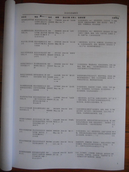 2021版最新西安企業(yè)黃頁包括《西安制造企業(yè)黃頁》、《西安民營企業(yè)黃頁》,現(xiàn)優(yōu)惠價:280元/冊。每冊內(nèi)容包括:單位名稱、地址、郵編、電話、傳真、郵箱、經(jīng)營范圍等;西安企業(yè)黃頁涵蓋了近幾年來最新成立的、有一定規(guī)模的企業(yè),具有非常高的營銷價值。有了這套黃頁開展業(yè)務(wù)也有了針對性,也省去了盲目去尋找客戶名單而浪費的時間了,工作效率也會有很大的提高。歡迎需要西安企業(yè)黃頁的朋友及時聯(lián)系我們!