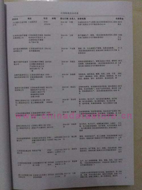 2021版最新江西企業(yè)黃頁包括《江西制造企業(yè)黃頁》、《江西貿(mào)易企業(yè)黃頁》、《江西民營企業(yè)黃頁》共三冊,優(yōu)惠價:280元/冊。每冊內(nèi)容包括:單位名稱、地址、郵編、電話、傳真、郵箱、經(jīng)營范圍等;江西企業(yè)黃頁涵蓋了近幾年來最新成立的、有一定規(guī)模的企業(yè),具有非常高的營銷價值。有了這套黃頁開展業(yè)務也有了針對性,也省去了盲目去尋找客戶名單而浪費的時間了,工作效率也會有很大的提高。歡迎需要江西企業(yè)黃頁的朋友及時聯(lián)系我們!