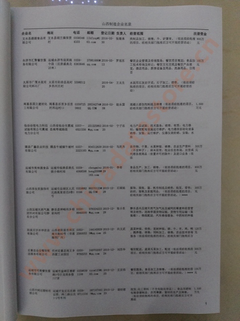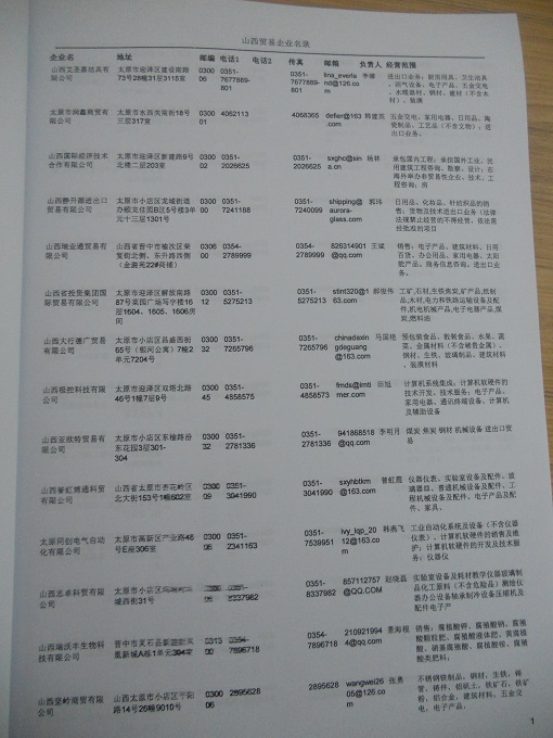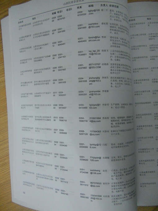 2021版最新山西企業(yè)黃頁(yè)包括《山西制造企業(yè)黃頁(yè)》、《山西貿(mào)易企業(yè)黃頁(yè)》、《山西民營(yíng)企業(yè)黃頁(yè)》共三冊(cè),優(yōu)惠價(jià):280元/冊(cè)。每?jī)?cè)內(nèi)容包括:?jiǎn)挝幻Q、地址、郵編、電話、傳真、郵箱、經(jīng)營(yíng)范圍等;山西企業(yè)黃頁(yè)涵蓋了近幾年來(lái)最新成立的、有一定規(guī)模的企業(yè),具有非常高的營(yíng)銷價(jià)值。有了這套黃頁(yè)開展業(yè)務(wù)也有了針對(duì)性,也省去了盲目去尋找客戶名單而浪費(fèi)的時(shí)間了,工作效率也會(huì)有很大的提高。歡迎需要山西企業(yè)黃頁(yè)的朋友及時(shí)聯(lián)系我們!