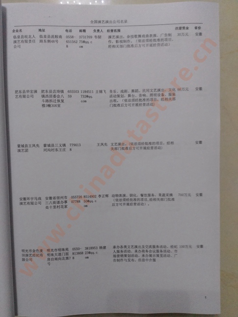 | 某省或直轄市 | 如上海、浙江演藝演出企業(yè)名單 | 80% - 90% | 600元 | 附贈一冊演藝演出紙質(zhì)印刷品 |
