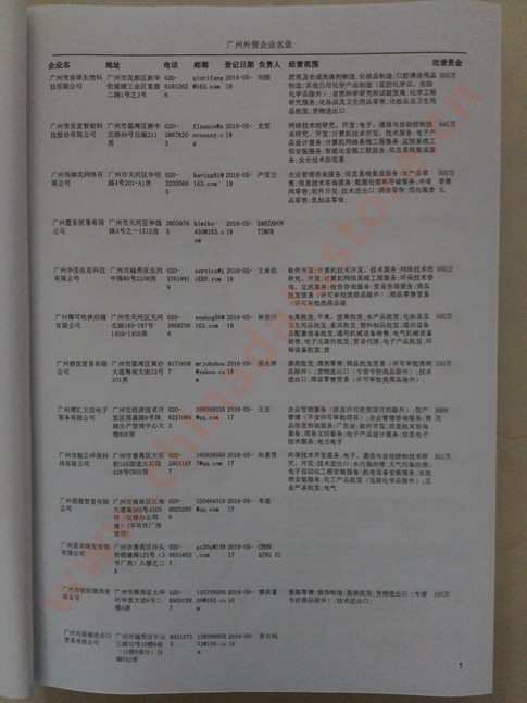 廣州外貿(mào)企業(yè)黃頁(yè)包括:外貿(mào)企業(yè)名稱、地址、電話、傳真、郵箱、經(jīng)營(yíng)范圍、注冊(cè)資金等信息。
