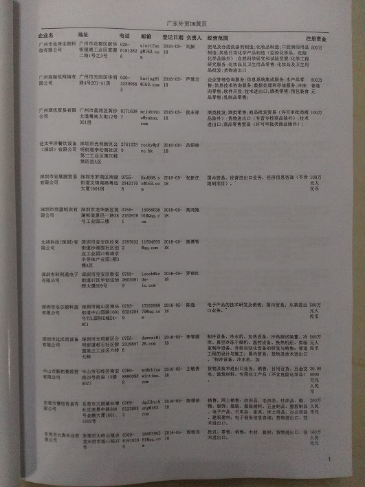 廣東外貿(mào)企業(yè)黃頁包括:外貿(mào)企業(yè)名稱、地址、電話、傳真、郵箱、經(jīng)營范圍、注冊資金等信息。