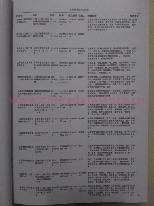 上海外貿(mào)企業(yè)黃頁包括:外貿(mào)企業(yè)名稱、地址、電話、傳真、郵箱、經(jīng)營范圍、注冊資金等信息。