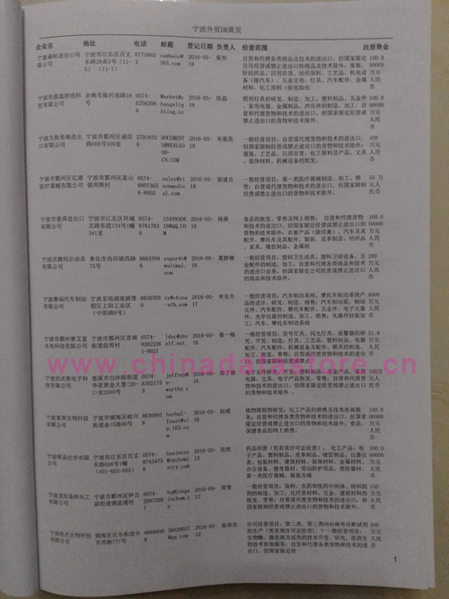 寧波外貿(mào)企業(yè)黃頁包括:外貿(mào)企業(yè)名稱、地址、電話、傳真、郵箱、經(jīng)營(yíng)范圍、注冊(cè)資金等信息。
