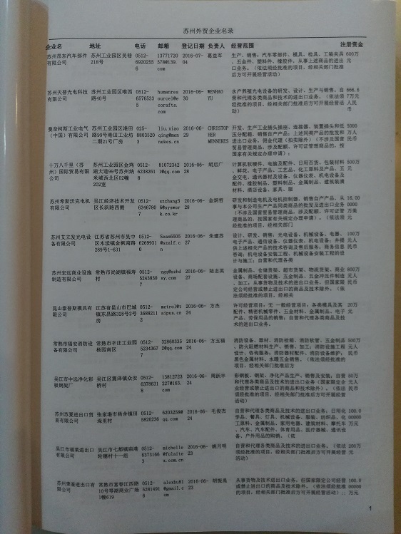 蘇州外貿(mào)企業(yè)黃頁包括:外貿(mào)企業(yè)名稱、地址、電話、傳真、郵箱、經(jīng)營范圍、注冊資金等信息。