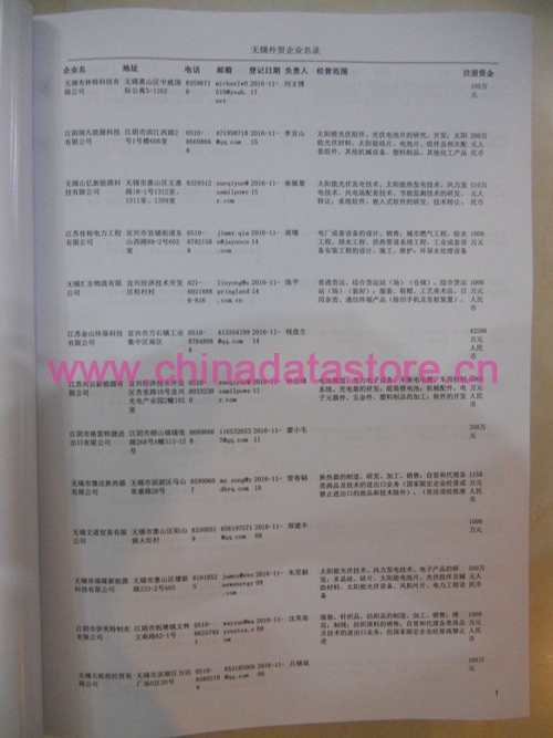 無錫外貿(mào)企業(yè)黃頁包括:外貿(mào)企業(yè)名稱、地址、電話、傳真、郵箱、經(jīng)營范圍、注冊資金等信息。