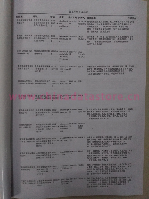 最新青島外資企業(yè)黃頁涵蓋了青島外商獨資企業(yè)、中外合資經(jīng)營企業(yè)以及港、澳、臺資企業(yè),包括青島臺資日資企業(yè)黃頁,青島外企黃頁具體內(nèi)容包括:企業(yè)名稱、地址、電話、傳真、郵箱、經(jīng)營范圍、注冊資金等信息;青島外企黃頁里面的企業(yè)都一些中外合資的大企業(yè),這些公司經(jīng)濟實力都比較雄厚,出口產(chǎn)品也比較多,業(yè)務(wù)范圍都比較廣,跟他們開展業(yè)務(wù)往來都比較容易;有了青島日企臺企黃頁開展業(yè)務(wù)也有了針對性,也省去了盲目去尋找客戶名單而浪費的時間了,工作效率也會有很大的提高.歡迎需要青島外資公司黃頁的客戶及時聯(lián)系我們!