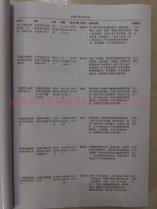 最新無錫外資企業(yè)黃頁涵蓋了無錫外商獨資企業(yè)、中外合資經(jīng)營企業(yè)以及港、澳、臺資企業(yè),包括無錫臺資日資企業(yè)黃頁,無錫外企黃頁具體內(nèi)容包括:企業(yè)名稱、地址、電話、傳真、郵箱、經(jīng)營范圍、注冊資金等信息;無錫臺企日企黃頁里面的企業(yè)都一些中外合資的大企業(yè),這些公司經(jīng)濟實力都比較雄厚,出口產(chǎn)品也比較多,業(yè)務(wù)范圍都比較廣,跟他們開展業(yè)務(wù)往來都比較容易;有了無錫外資企業(yè)黃頁開展業(yè)務(wù)也有了針對性,也省去了盲目去尋找客戶名單而浪費的時間了,工作效率也會有很大的提高.歡迎需要的客戶及時聯(lián)系我們!